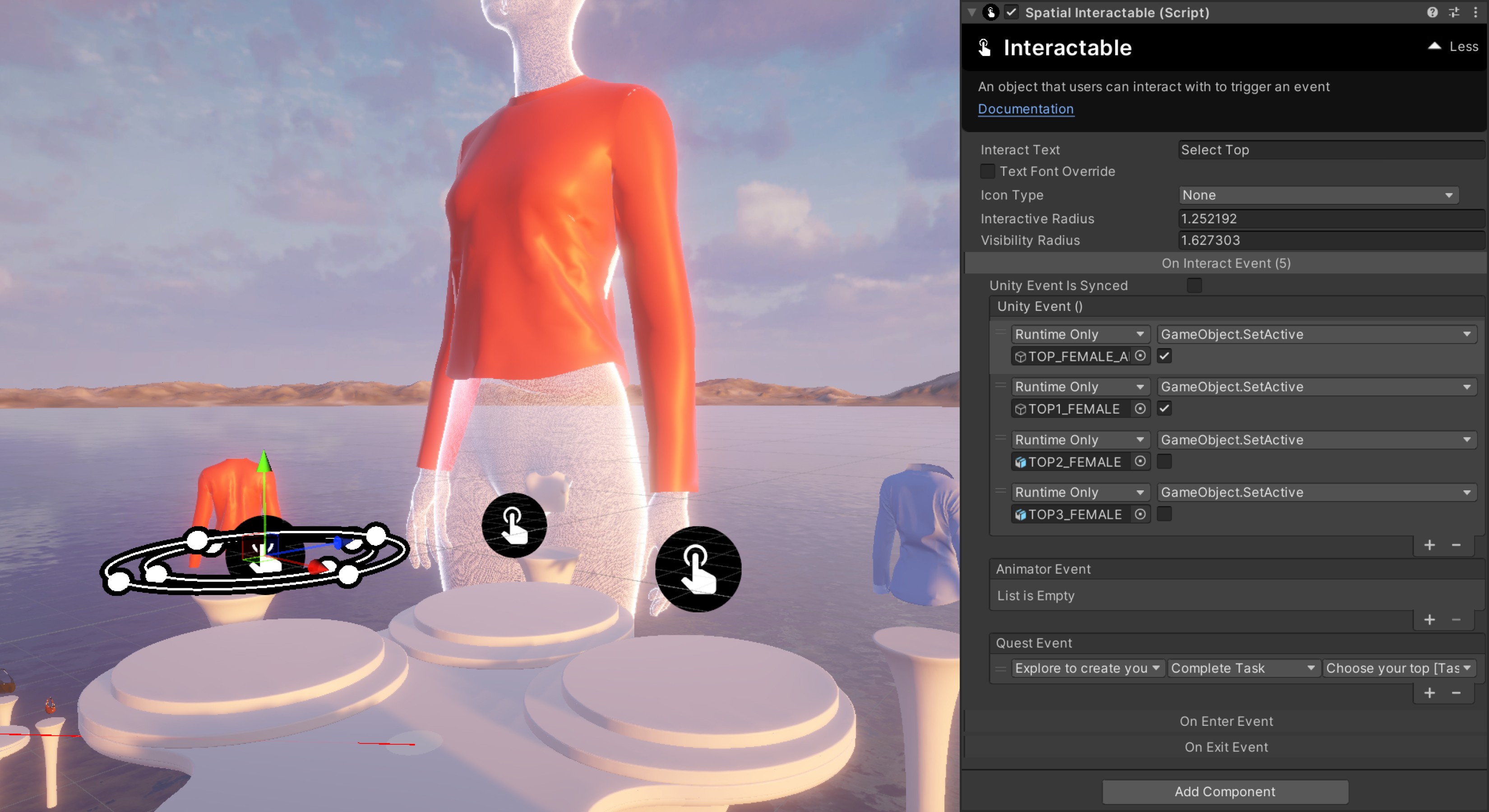 We designed the environment in Rhino7 and prepared all the various 3D garments using CLOD3D. We then import everything into Unity to implement animations and interactions using the Spatial.io toolkit.