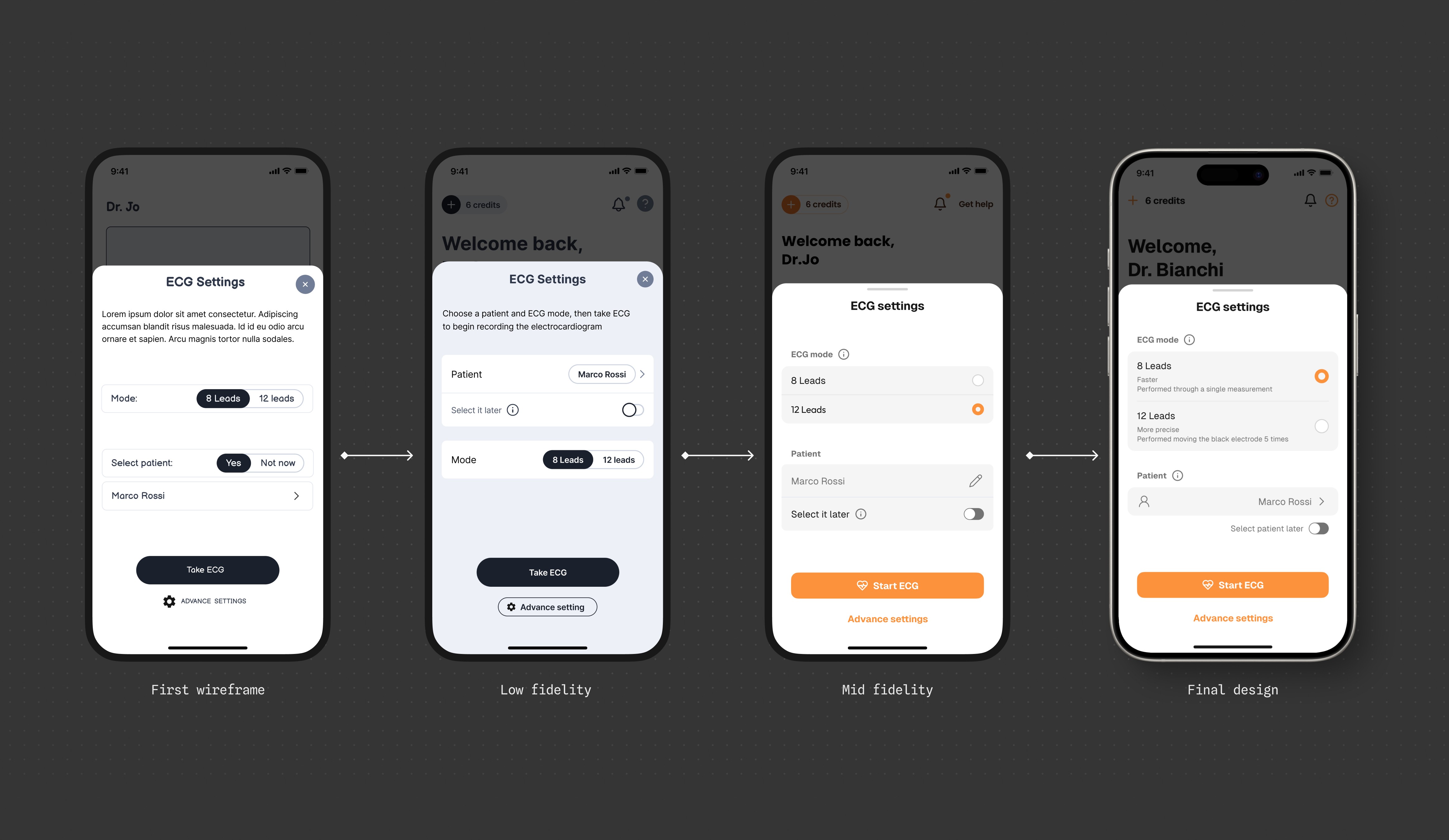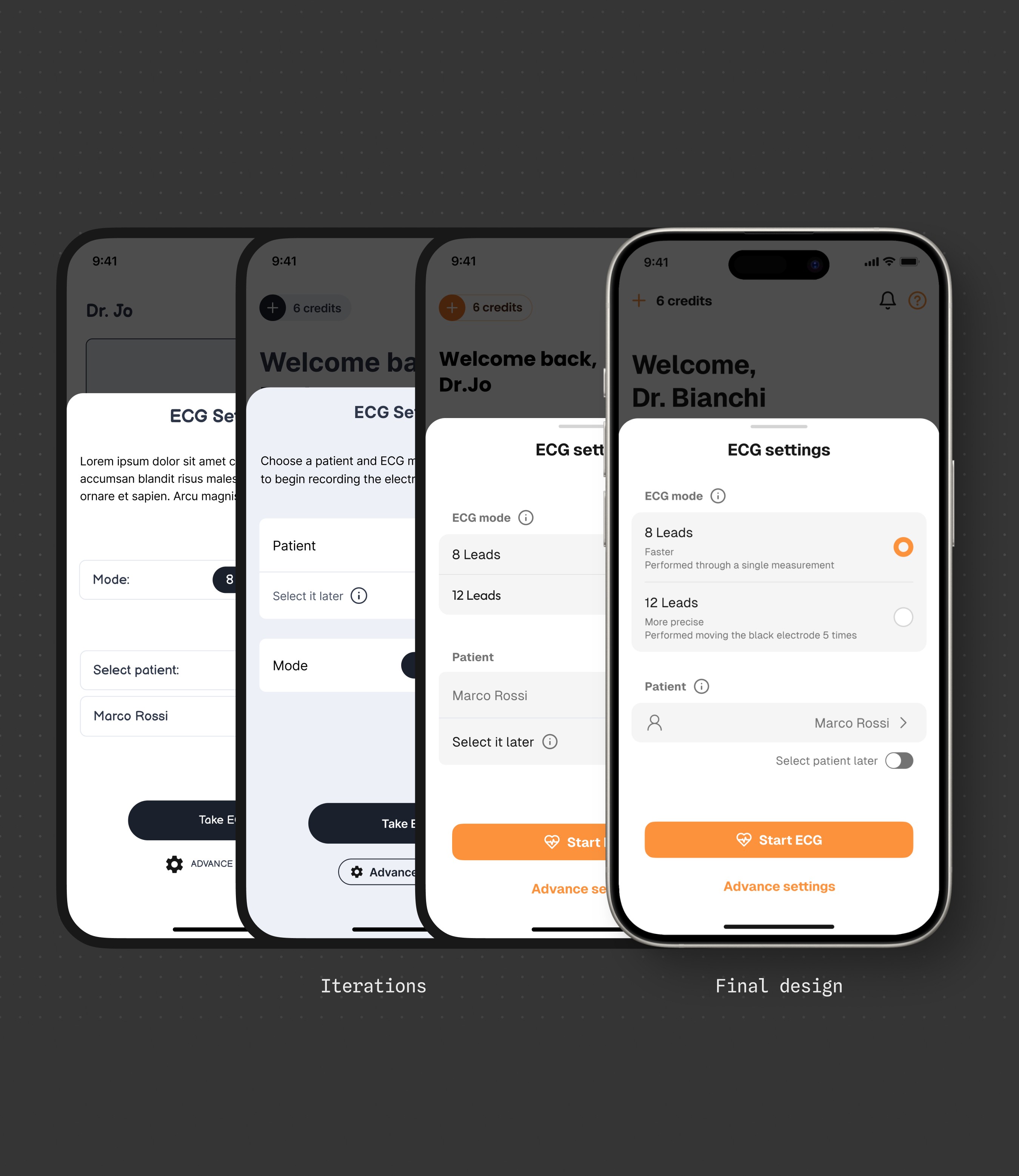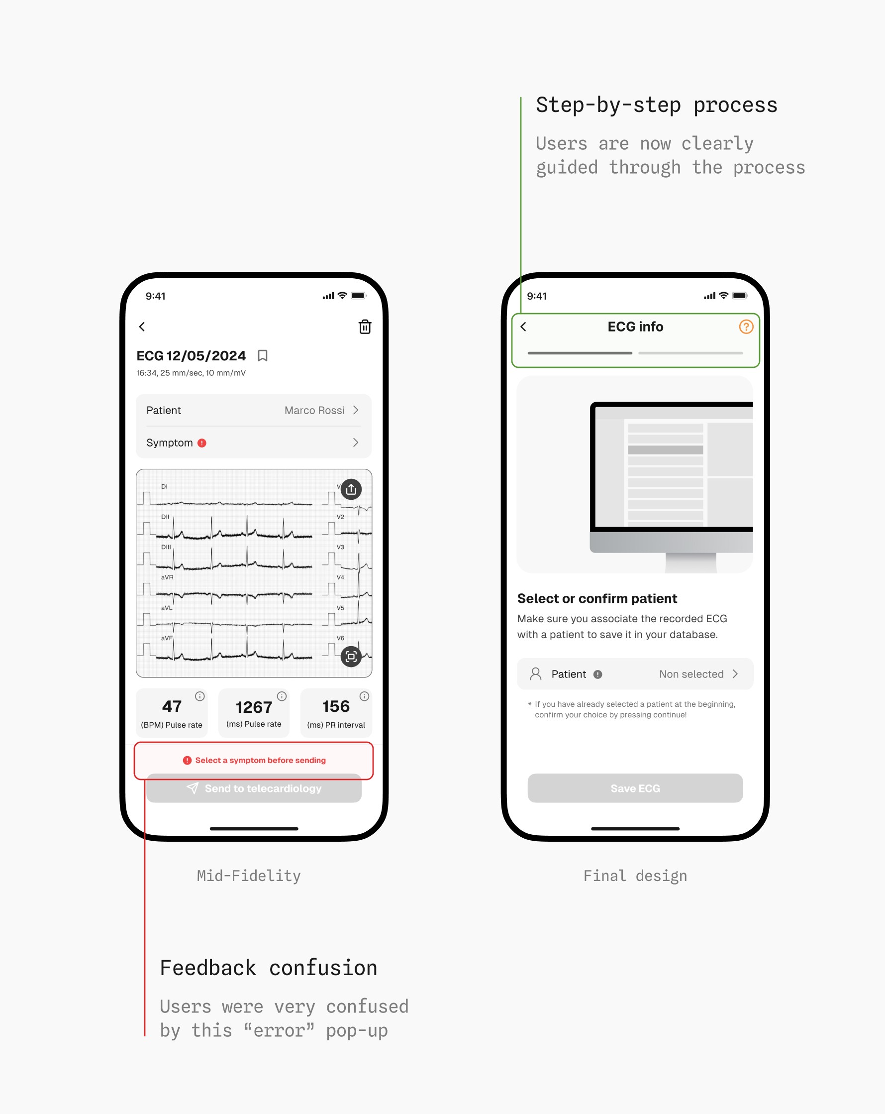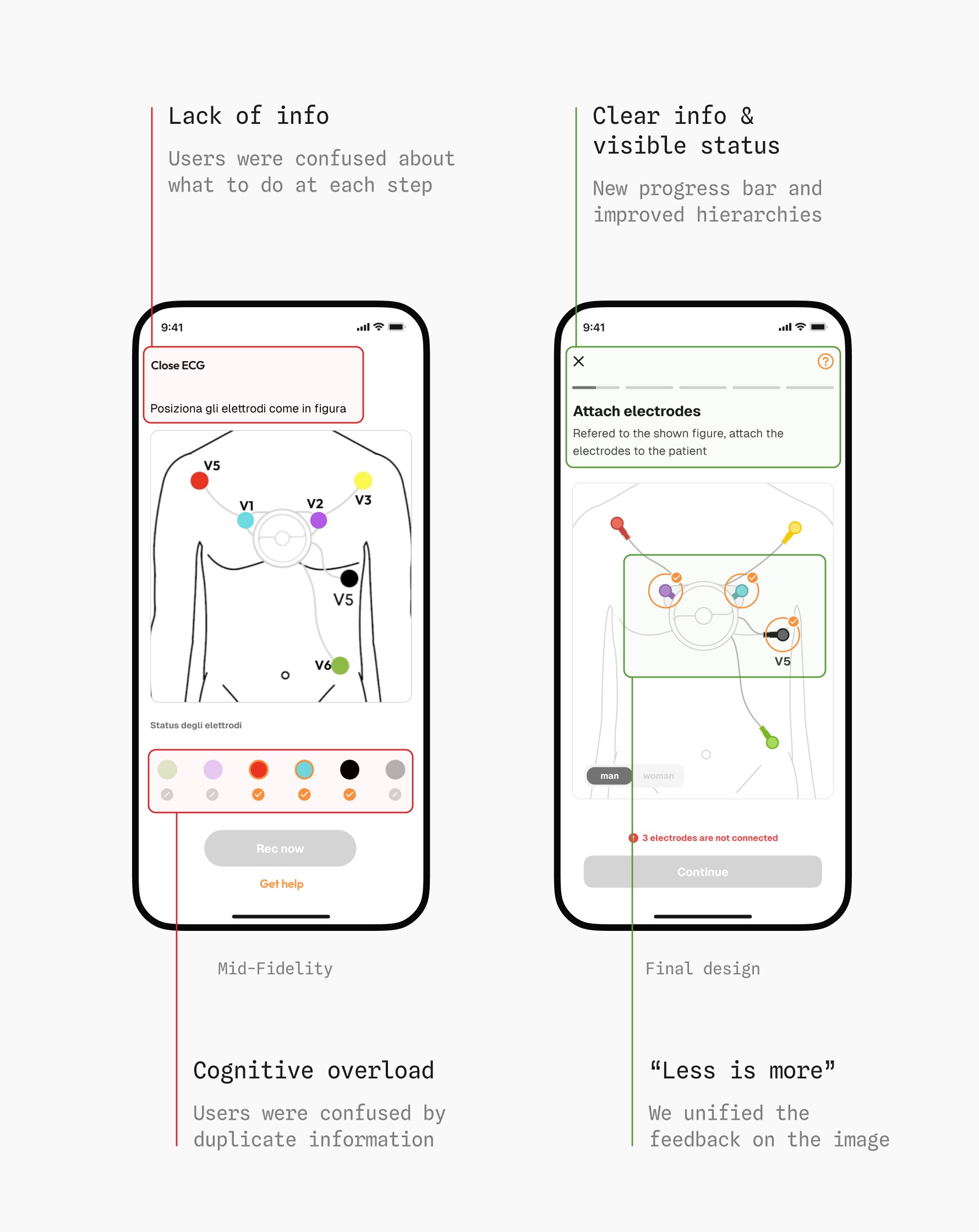The ECG recording flow was the most complex. With electrode placement involving repeated interactions, we had to carefully organize information to avoid cognitive overload.