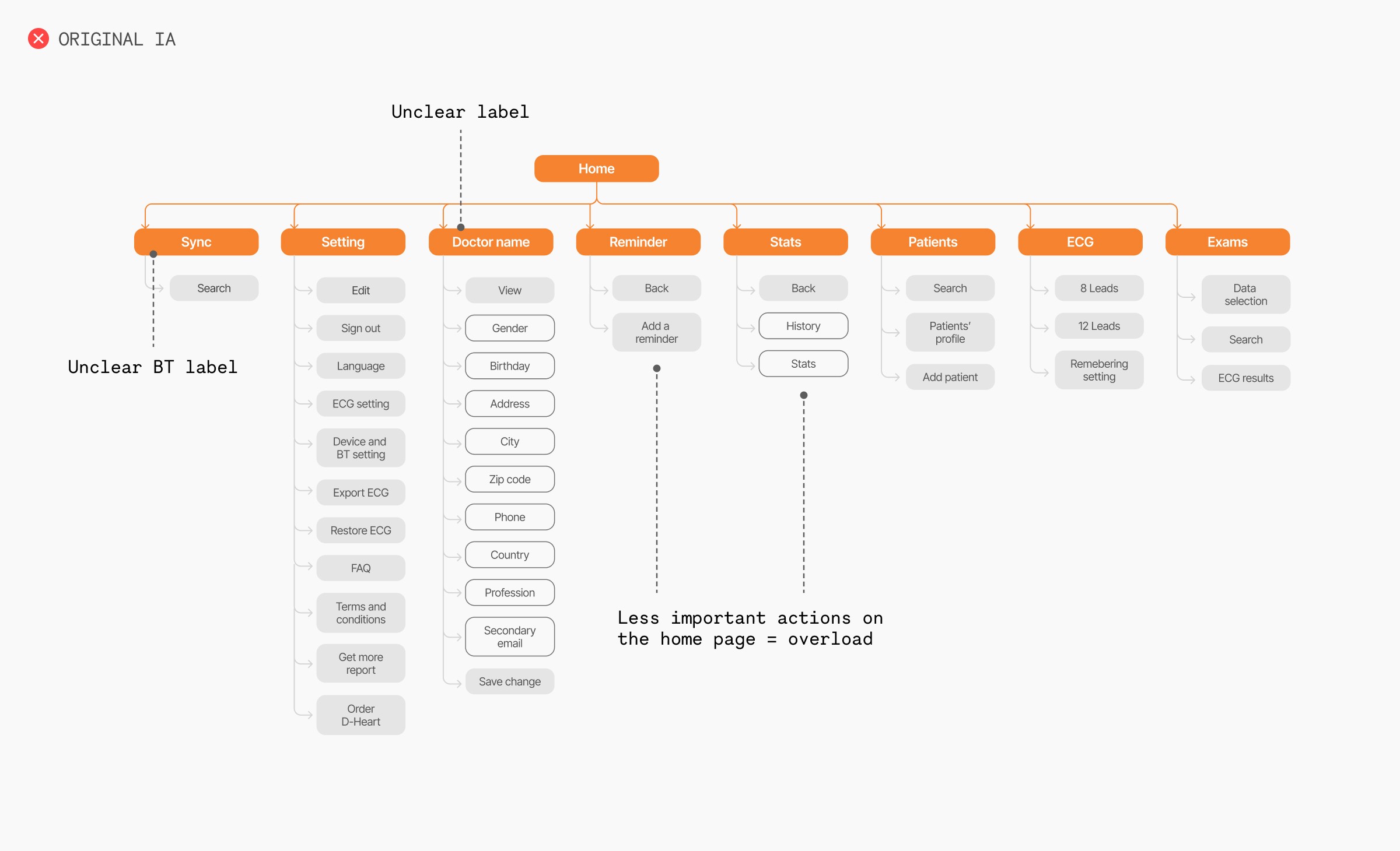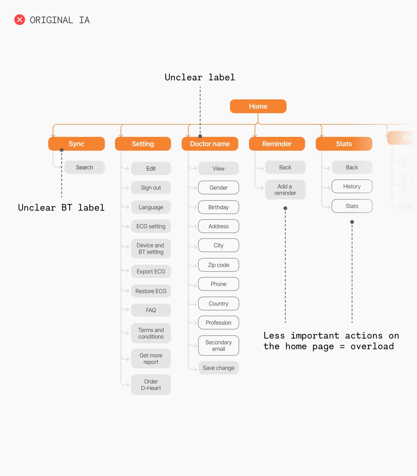 The first step in our two-month process was to tackle the app’s confusing and disorienting information architecture. We streamlined and reorganized it to create a solid foundation.