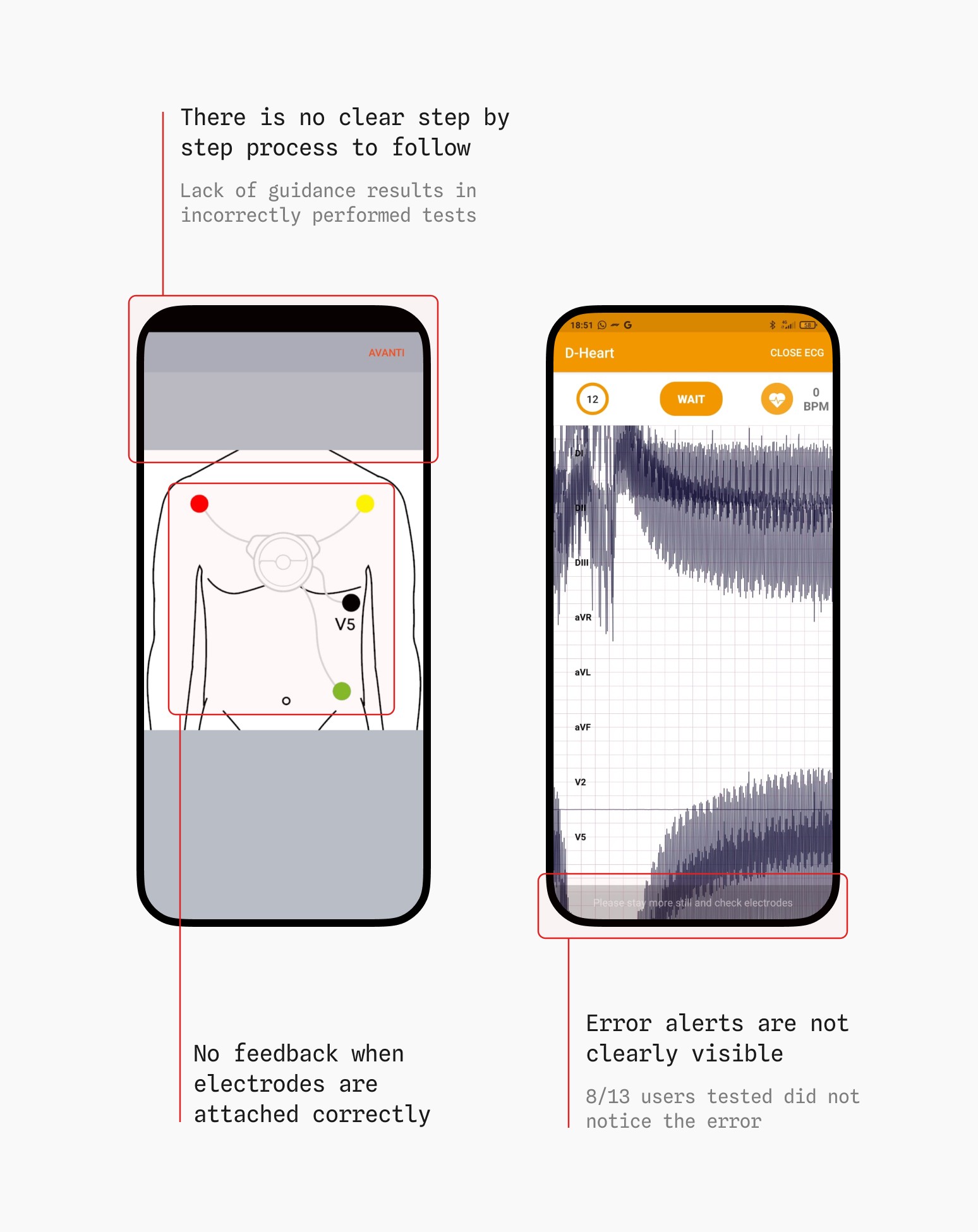 Using D-Heart as a doctor to perform electrocardiogram on patients, presents multiple frictions. The system lacks sufficient guidance, leading to user frustration and unreliable ECG results.